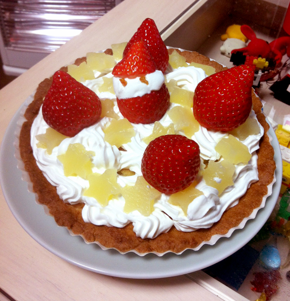 クリスマスケーキをタルトで焼いて生クリーム乗せたいいかげんなやつで作りました。