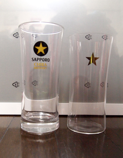 ☆かわゆす!!!うすづくりのグラスのいいところは、左と見比べてみてもらうと分かりますが、下のところにガラスだまりが分厚くできないので、CMなんかでほんとによく使われていて、「ビールだけをかたまりで持ってる」みたいに見えるから見栄えがいいんですよね。