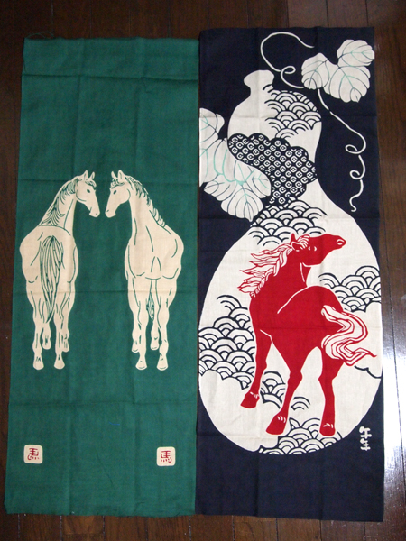 馬の字をひっくり返した「ひだりうま」は「うま」→「まう」→「舞う」、という事でめでたい席の舞いを躍る意味から、福招き的な意味合いがあるらしーです。そういう絵らしいです、緑の方は。