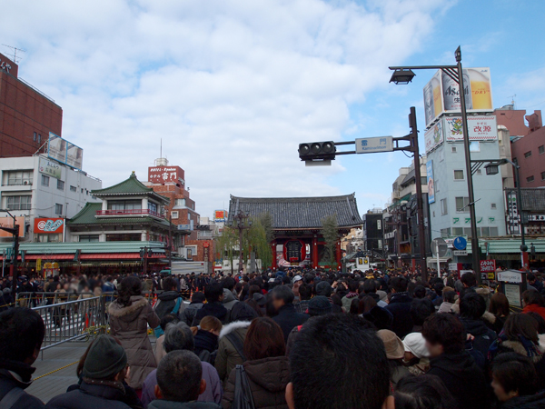 浅草寺の周囲の太い道を歩行者天国みたいにした上に、雷門のところを中心にしたT字路を全部参拝客の並ぶ列にして、DJポリスまで駆り出されてんすよ!?どんだけ混んでんの!