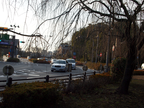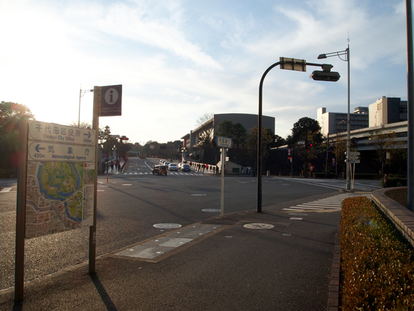 信号渡った先に見える四角い建物が、東京国立近代美術館です。
