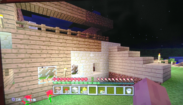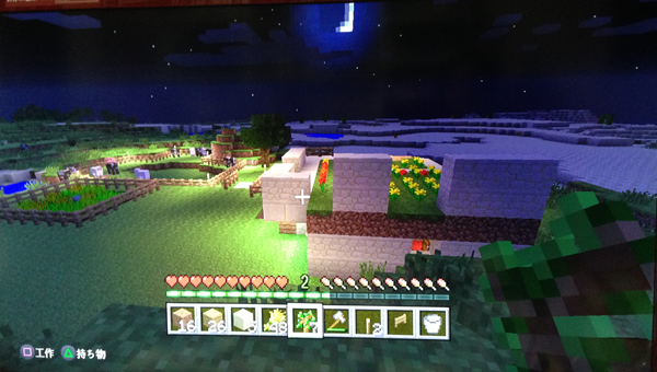 特に敵もいないしお腹も減らない生活なので(画像の下中央にあるゲージにハートとかがあると思うのですが、あれが本当は増えたり減ったりします、私はずっと満タンです)夜通し遠出しまくったりしますが、正しく家に戻れるかなーと真っ暗な中、足下おぼつかなく戻ってくると、遠目に家の明かりが見えると、文明のありがたさや、家の暖かみを思ってちょっと涙が出る程です。