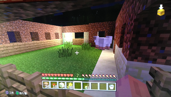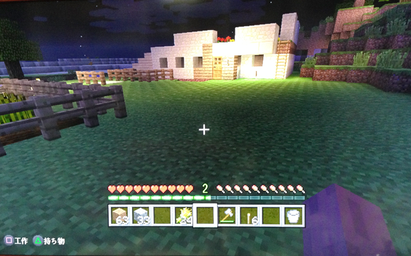左のほうにあるのは、小麦畑と農場です。柵で囲ってあれやってこれやって、というご指南にそって作ってみましたけど、結局おなかが減らないから畜産農業ごっこなんだ…