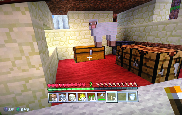 ちなみに、この赤い花と黄色い花はそれぞれ染料になるので、羊から取った羊毛を染めてカーペットにしたりすることができます。あ、3つ上の羊がチェストの上に乗ってる画像の床は、赤い花で染めたカーペットを敷いています。赤が初期からある色で嬉しい〜