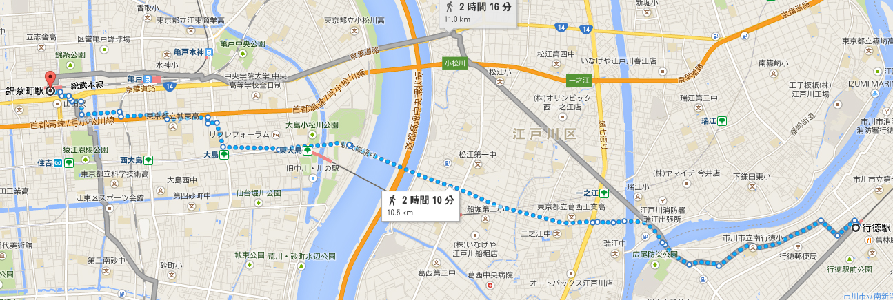 私の最寄り駅、行徳駅から計算すると、錦糸町まで徒歩で2時間ちょっと。