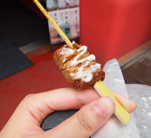 次は「寺子屋本舗」のぬれ煎餅。串に刺しててマヨネーズとかかかってるやつを食べました!
