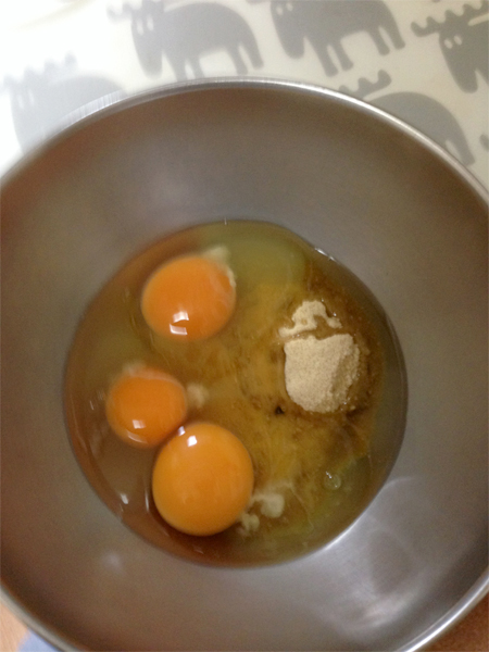 たまご3個ときび砂糖を泡立て器で泡立てます。