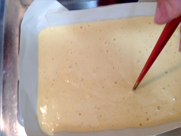 ホーローバットに敷いたわら半紙の中に生地を流し込んで、竹串でジグザグに切って大きな泡を消す、という作業。
