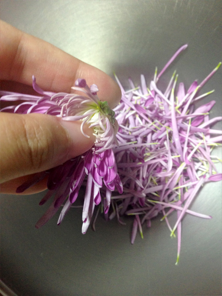 テレビ?でやってた作法のとおり、まんなかを指でつまんで、くるくる回しながら「すき、きらい」を大量におおざっぱにむしりながらやる要領で花弁をむしっていきます。