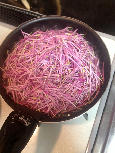 花弁がお湯になかなか沈みません。ぐいぐい押し込みます。