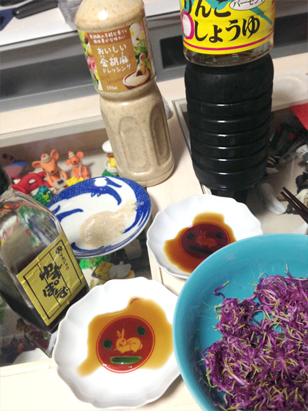 某くっしー先生に聞いたりクックパッドのレシピなんか見つつ、「ポン酢」「しょうゆ」「ごまドレッシング」をつけて食べてみました。