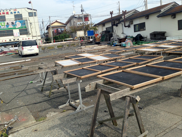 しらすを干す網が漁師さんたちのいるところにずらり。