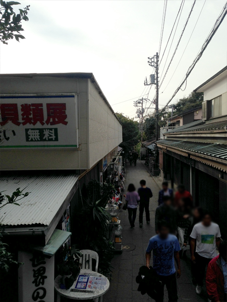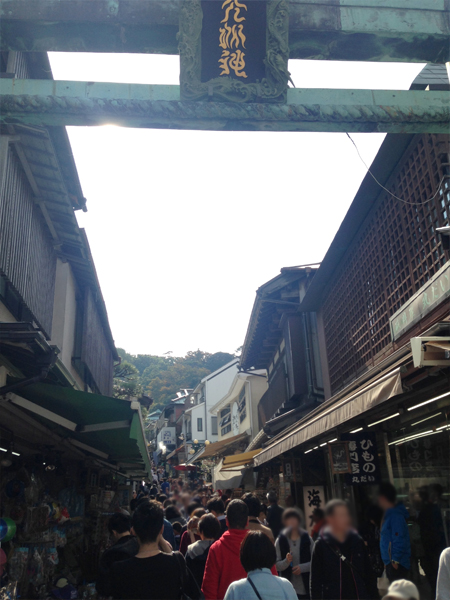 江ノ島に到着してすぐに現れる青銅の鳥居をくぐると、メインストリートの弁財天仲見世通りです。いわゆるお土産屋さんとか食べ物やさんがずらりで大混雑です。