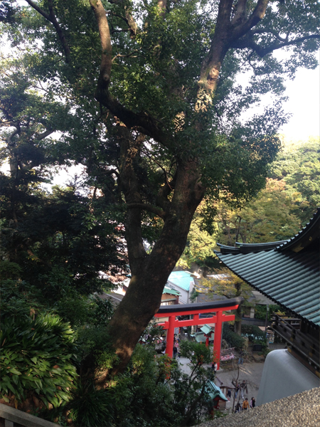どんどん階段登ります。結構ハード。赤い鳥居が江島神社の鳥居です。