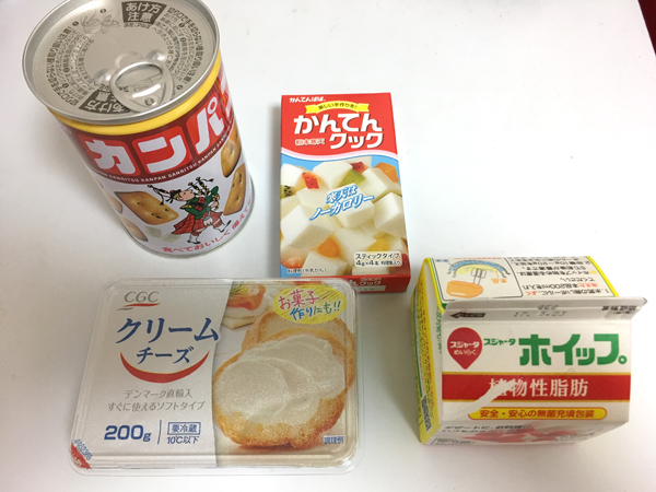 材料は賞味期限間際の乾パン、クリームチーズ、生クリーム、寒天、あと砂糖ですね。