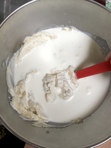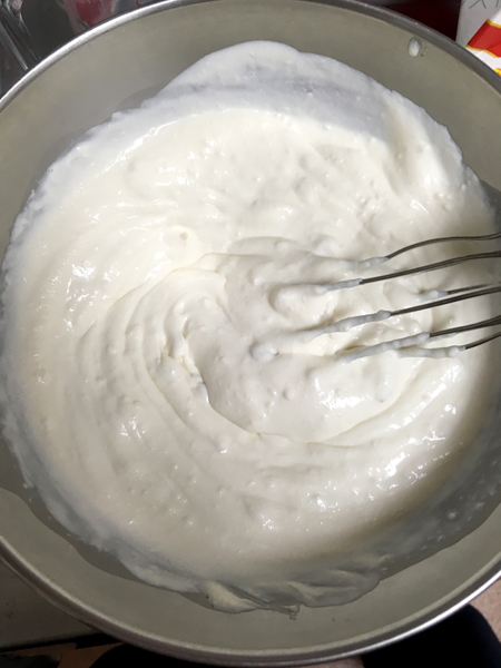 ヘラで混ぜてても意味ないのね。泡立て器で混ぜるといきなりぐっと混ざりますね。