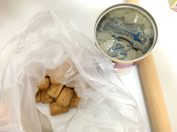 氷砂糖を除いた乾パンをビニールに入れてすりこぎでボッコボコにします。