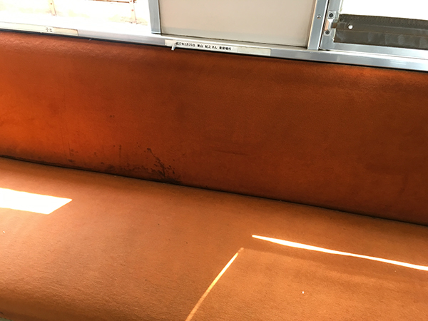 目の前のシートの背もたれの上のところに何やらテプラで書いてあります。
