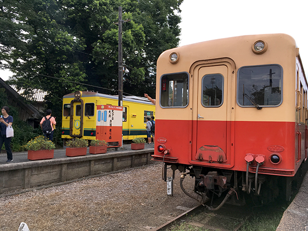 手前の小湊鉄道から、奥の黄色いいすみ鉄道に乗り換えます。