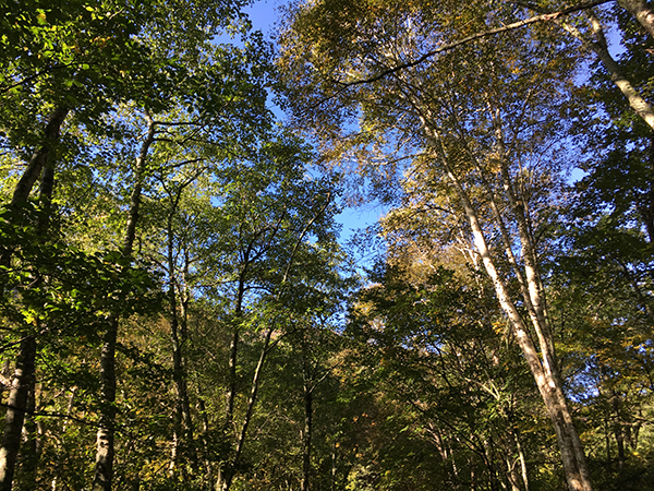 木漏れ日の中、無料駐車場(駅から若干離れてて混雑が予想される日に解放されるらしい、そこを確保するために早朝出発だったとか)から駅まで歩きます。