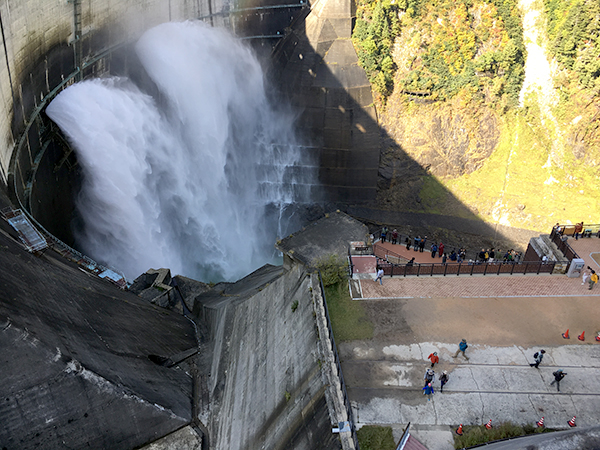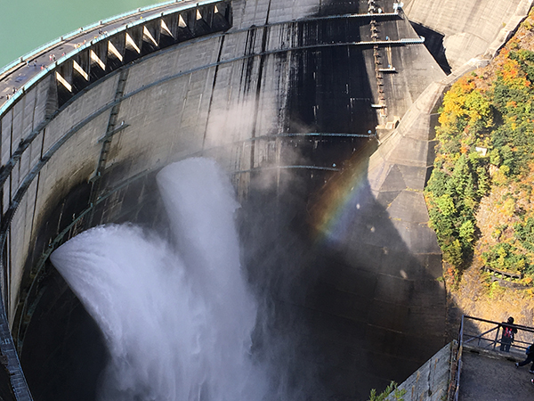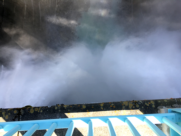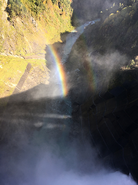 早朝の太陽の角度のおかげか、ダムからの放水(観光放水っていうらしいです、実際にこの水で発電してるわけではないとのこと)に虹がかかってとても綺麗。